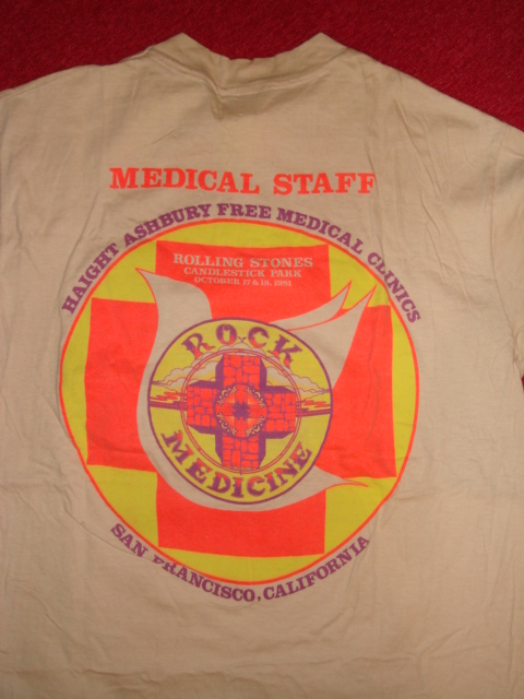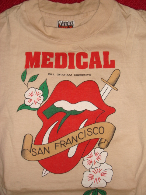 表の MEDICAL の下にプリントされてる「BILL GRAHAM PRESENTS」。60’s-70’sのロック好きの人なら知ってると思います。数々のミュージシャンやロックイベントを裏で支えていたロック界を代表するプロモーター・ビルグレアムTシャツです。ストーンズのイベントTにですら、名前がわざわざ載せられるくらいだから、彼が当時世間に与える影響力はすごかったのです。